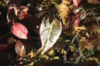 落ち葉に埋もれたレンギョウの枝先には、花芽が。