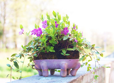 ツルニチニチソウ メタリックな紫の鉢と仲良し