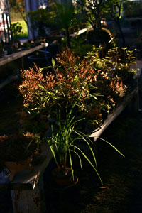 掃き掃除をしていると、意外な場所につよい勾配がついていたり、あまり手を入れることのなかった場所の草たちが、驚く程に勢力を拡大していることに気づきます。棚下付近は、盆栽の種がこぼれて 意外な植物が元気に育っています。長い間 みんなに踏みしめられた通路は、へこんだり ふくらんだり 土がむき出しになったりして 三和土のよう。貫禄のある地面になってきたなぁと眺めています。