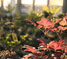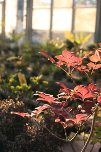 温室の中央に カツラの古い大きな根洗いがあります。歳月を重ね 細やかに伸びる枝先で、光に透けるハート形の葉が 桃色や黄色に色づきはじめています。