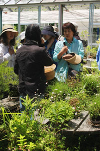 雨の止み間の日射しが ギラッと強くなってきました。寒冷紗を庭の一部に張り、扇風機のカバーをはずし、夏を迎える準備を整えます。雨粒を乗せ、みどりを一層深くした植物たちが、光をうけて輝いています。