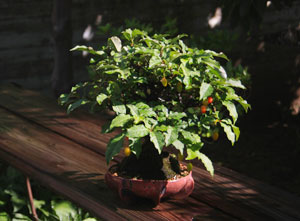 このビックリグミ、樹齢はおそらく40歳を超える、背丈も50㎝に満たない盆栽です。結実のための工夫(肥料を多く与えるなど)もしていません。どこからこの実をつけるエネルギーを捻出するのでしょう。考えるとすごいことだなと思います。