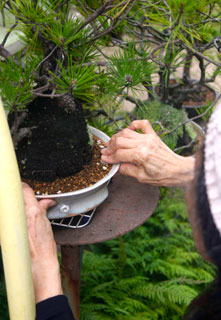 古葉を払い 剪定などを施して、様子を確認しながら 鉢の隅に必要な分を少しだけ。