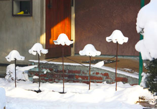 モノクロームの庭の写真。広い庭に びっしりとはり巡らされた盆栽棚。