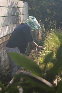 クレーンの上と下で叫びあう声。周りの竹林を伐採する音。機械音と大勢の声が止むと、やけに大きく鳥の声も聞こえてきます。