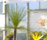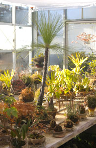 加藤さんは 温室で、 草の古葉にハサミを入れています。