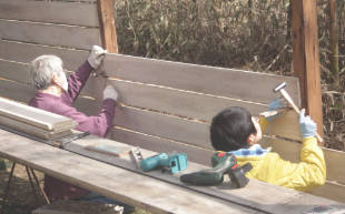 残るは 柱を建て 板を貼る作業。順調に3区画を張り終えた時、強い風が吹き、