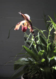 ミツバツツジの鉢の根本には、シダのまるい芽がぽこり。