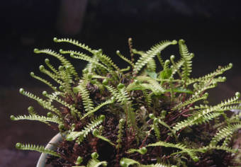 ミツバツツジの鉢の根本には、シダのまるい芽がぽこり。