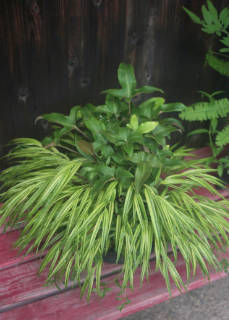 松の根元には 低木やシダ類が茂り、道路沿いにはアジサイが咲いています。