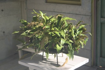 盆栽だったもの。うねるような根も、駐車場のレンガを浮き上がらせる暴れっぷりです。