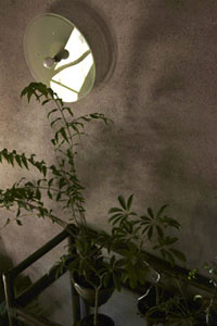 上方の丸いガラスの照明板には 外の庭が映っている。