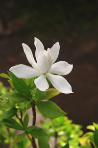 うす暗くなった温室で クチナシの花の純白がくっきり浮かんでいる。