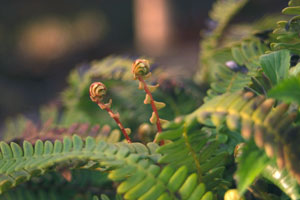 黄みどりやオレンジの発色が入り交じったカリンの新芽は