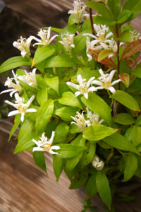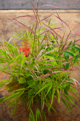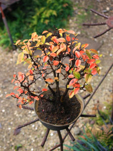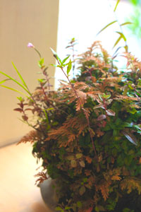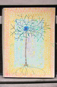 虹色のグラデーションを下地にして 四方に葉をひろげるキンシナンテンを大きく描いた。