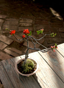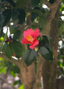 食卓から近い所に植えた ツバキの古木が 花を咲かせている。