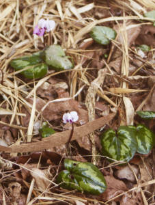 3月3日 となりの林で咲いている 原種のシクラメンのピンクや