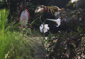 それは 入り口近くの鉄のスタンド上の ゼンマイと共生するユリの花が