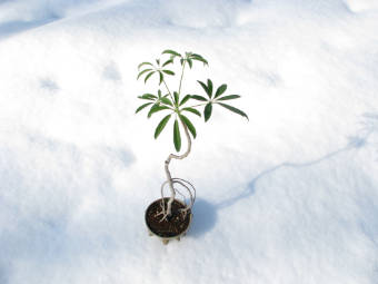極寒の時は 常緑の葉を黒っぽく変色させて 雨傘をつぼめたようにして