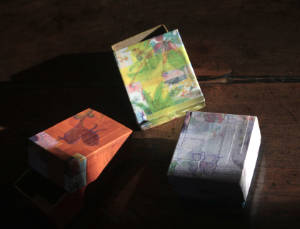 切り貼りして作った小さな箱に 思いつくまま彩色していく。